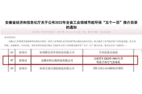 入選2023年全省工業(yè)領域節(jié)能環(huán)?!拔鍌€一百”推介目錄(節(jié)能環(huán)保新產(chǎn)品新裝備:G-ZKDY-2500-Y1型等離子體空氣消毒機)