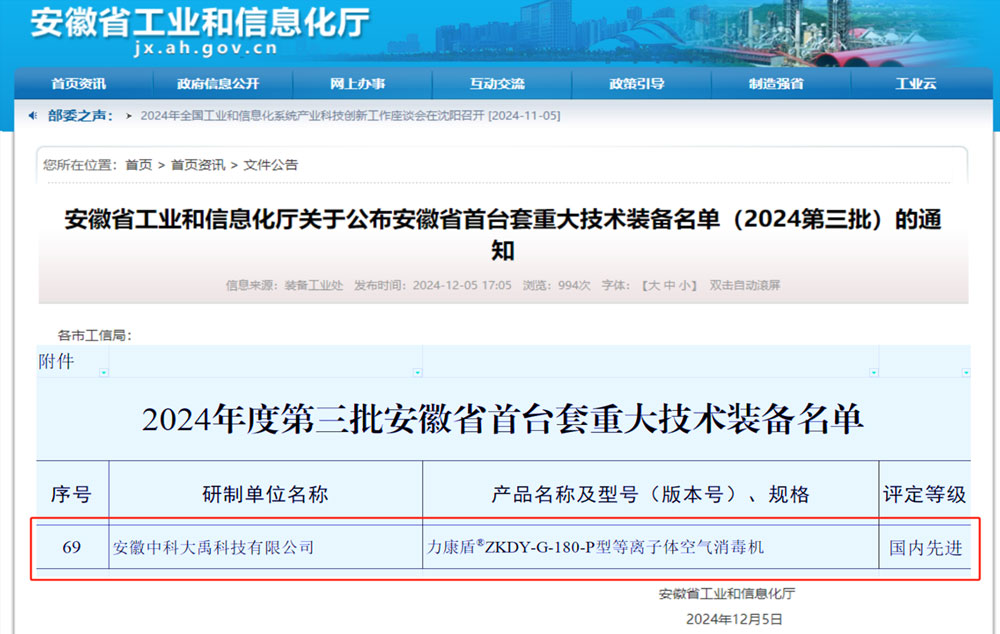力康盾?ZKDY-G-180-P型等離子體空氣消毒機入選2024年度第三批安徽省首臺套重大技術裝備,評定等級:國內(nèi)先進
